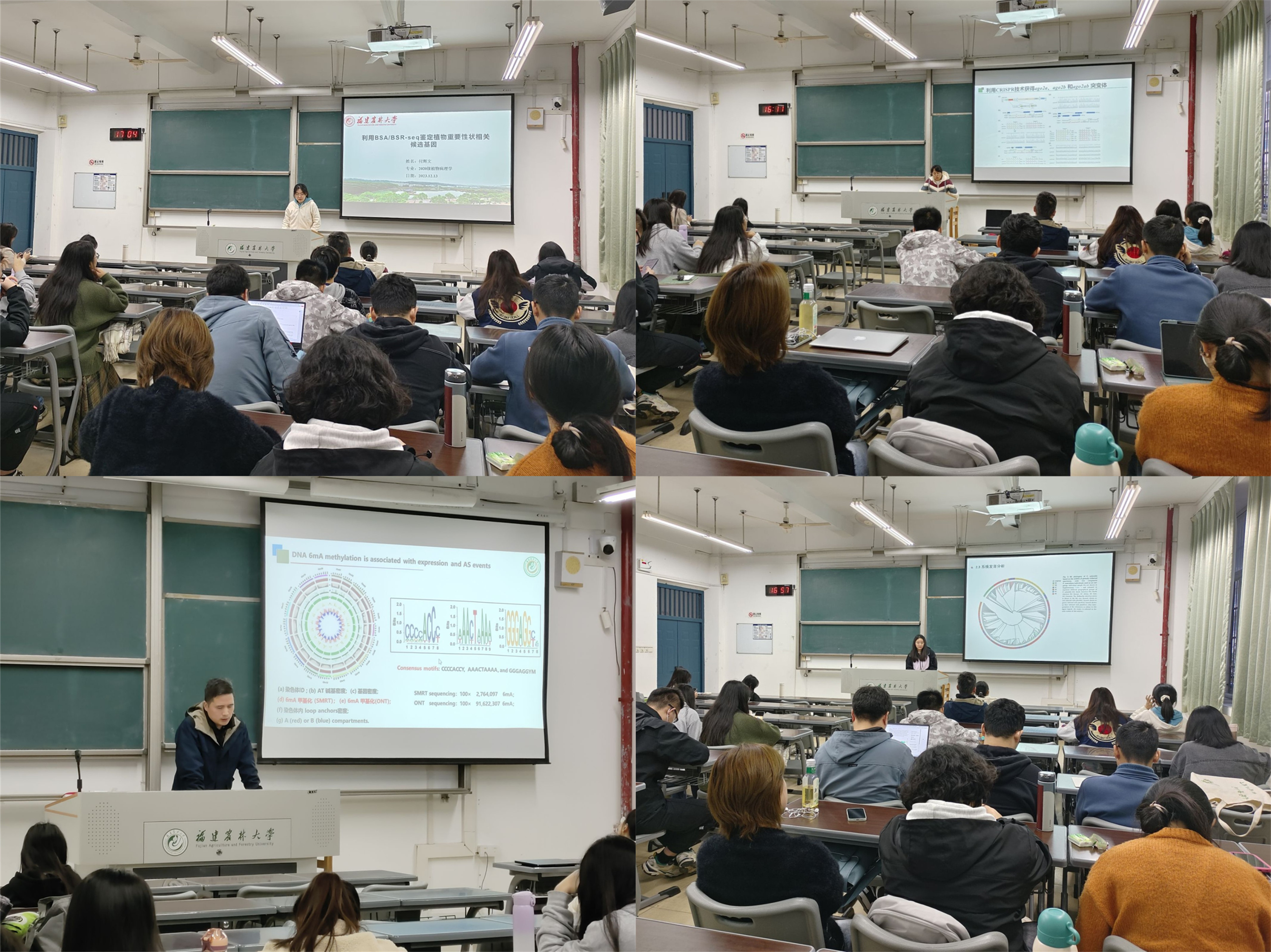 会上,四名博士研究生围绕各自专业的科研内容和研究进展,分别以AGO2a but not AGO2b mediates antiviral defense against infection of wild type cucumber mosaic virus in tomato、基于多组学数据完善花生基因组注释及基因可变剪接研究、小菜蛾Wolbachia感染多样性、BSA BSR-seq定位基因为题进行了生动的分享汇报,向同学们展示了各自的研究进展、实验方法以及科研过程的心得体会。随后,主讲人与现场听众进行了互动交流,解答了同学们对研究内容的提问,共同探讨了实验方法和学习心得。