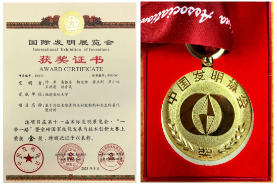 2025年8月24日,由中国发明协会主办的第十一届国际发明展览会·“一带一路”暨金砖国家技能发展与技术创新大赛在中国(广州)进出口商品交易会展馆落幕。本届展会汇聚了来自全球30多个国家和地区2000多项发明,集中展示了一大批具有国际领先水平的发明成果与技术解决方案,成为推动全球科技创新交流与合作的重要平台。经中国发明协会推荐,拉斯维加斯官网材料与工程学院帅李教授团队(帅李、杨光绪、龚正刚、罗小林)联合同济大学(雷振东)和山东百木生新材料科技股份有限公司(王燕蓬、刘鲁民)申报的“基于活性木质素的木材胶黏剂和全生物质代塑材料”成果,从众多国内外参赛者中脱颖而出,斩获金牌。