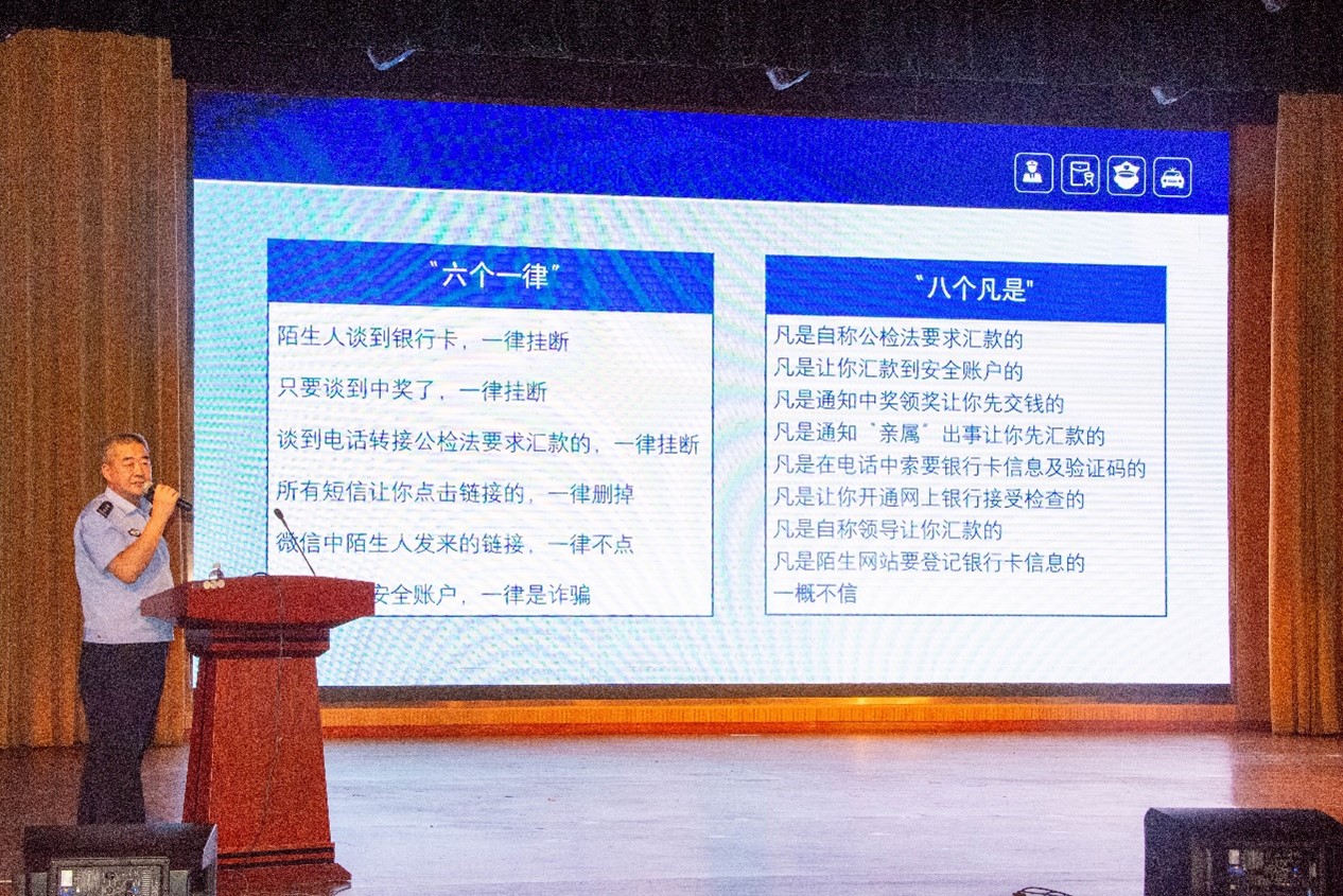 游斌所长结合三十多年来一线工作经验,围绕大学生活中可能面临的各类安全隐患,进行了系统而生动的讲解。内容涵盖防范电信网络诈骗、保障人身与财产安全、维护宿舍消防安全、注意交通安全以及遵守校规校纪等多个方面。