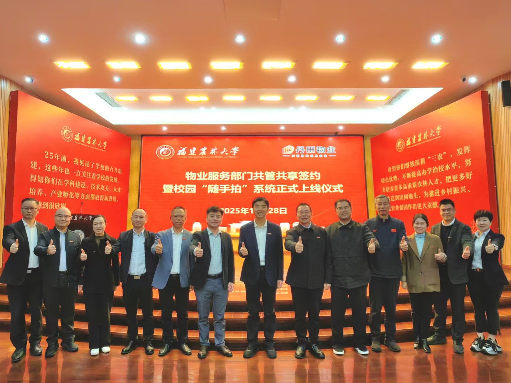 11月28日,后勤管理处在福州仓山校区常盛会议中心举行物业服务部门共管共享签约暨校园“随手拍”系统正式上线仪式。副校长林庆藩、珠海市丹田物业管理股份有限公司校园事业部总经理田俊华出席仪式,校党政办、校团委、图书馆、公共体育教学部、农学院、园艺学院等单位领导及相关部门综合科、仓山校区各学院党政办负责人、后勤管理处全体处科级干部及相关科室工作人员、丹田物业工作人员等近百人参加活动。仪式活动由后勤管理处处长曾海滨主持。