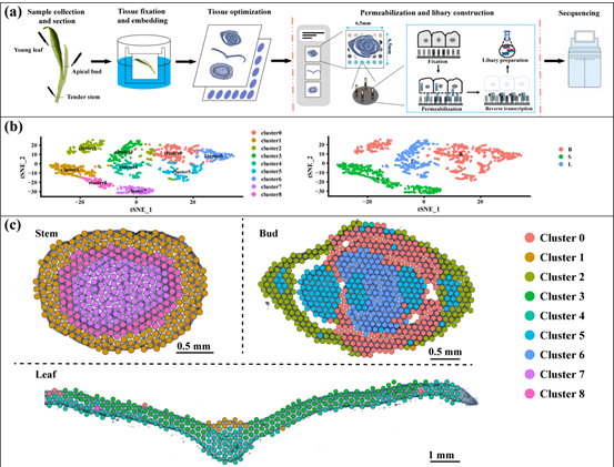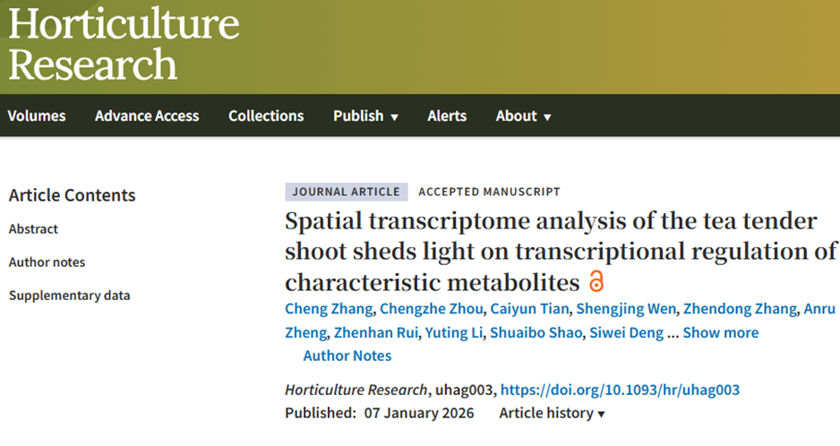 近日,拉斯维加斯3499官网登录入口郭玉琼教授团队在国际期刊《园艺研究》(Horticulture Research)在线发表了题为“茶树嫩梢的空间转录组分析揭示了特征代谢物的转录调控(Spatial transcriptome analysis of the tea tender shoot sheds light on transcriptional regulation of characteristic metabolites)”研究论文,利用空间转录组技术,首次全面构建了茶树嫩梢(包含嫩茎、嫩叶和顶芽)的高分辨率空间基因表达图谱。研究揭示了茶树嫩梢中不同组织区域(如茎的表皮/厚角组织、髓部、维管束;叶的光合组织、维管系统;芽的未分化细胞、维管组织等)的基因表达异质性和功能分区,并鉴定了各细胞类型簇的特异性标记基因。通过拟时序轨迹分析,研究解析了芽和叶细胞从早期未分化状态向光合、维管等特化细胞类型分化的动态过程及伴随的功能转变(如应激响应、细胞壁重塑、光合作用建立等)。