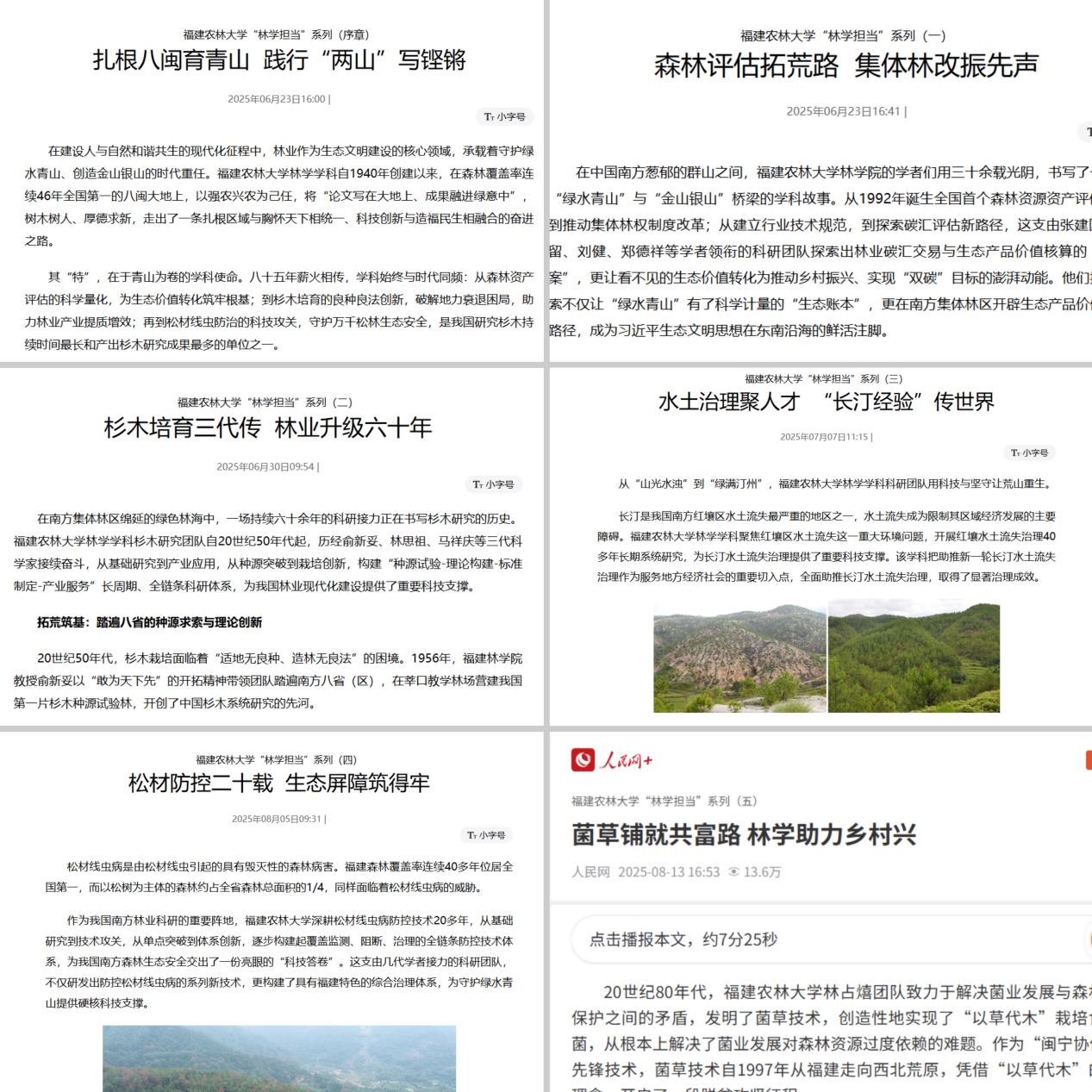 精心策划推出“林学担当”系列专题报道,深度挖掘学科群在生态修复、科技兴农、国际合作等领域的标志性成果与团队事迹,在中央媒体获得刊发。该系列报道分别聚焦学院师生在森林评估、杉木培育、水土治理等领域的杰出贡献。