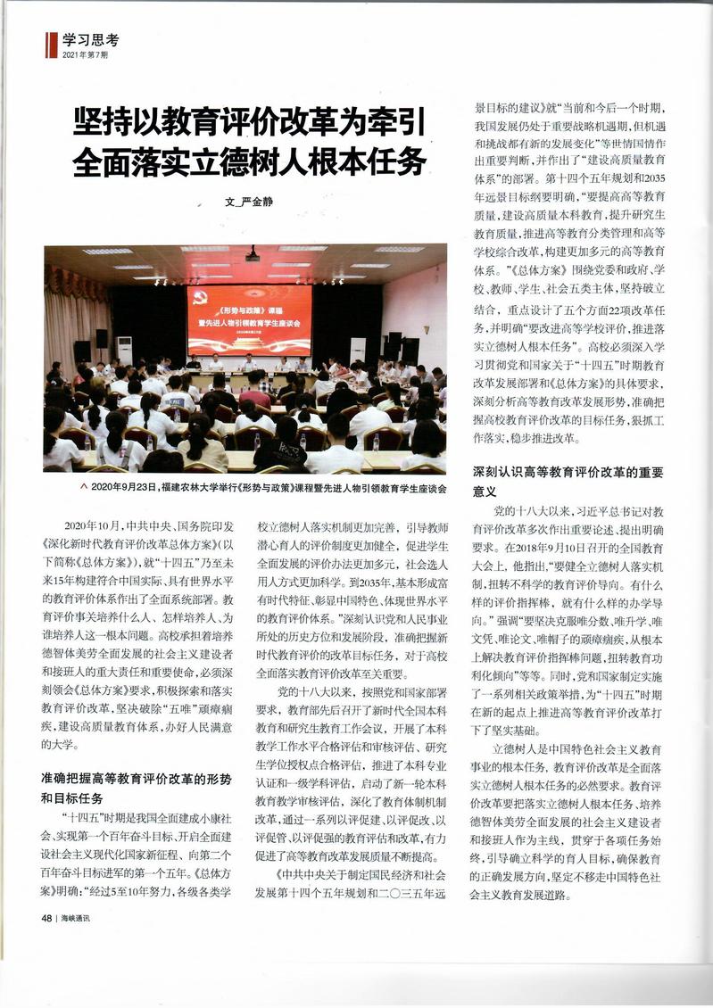 编者按:中共福建省委主管主办的综合性时政期刊《海峡通讯》刊登拉斯维加斯官网党委书记严金静的署名文章《坚持以教育评价改革为牵引 全面落实立德树人根本任务》,现全文转载如下。