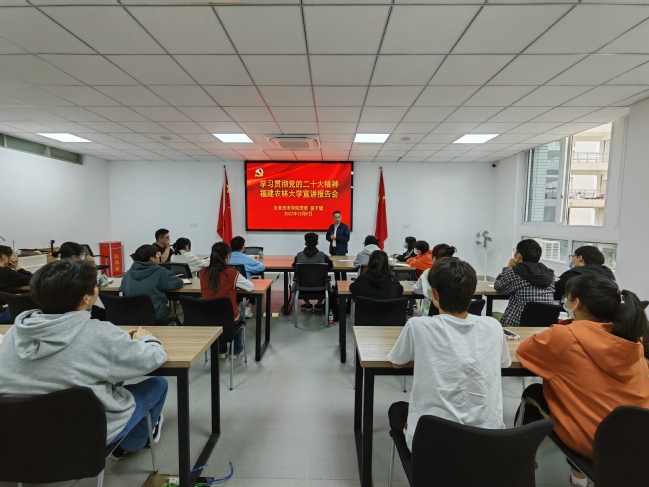 宣讲会上,翁子健从党的二十大的主题和主要成果、过去五年工作和新时代十年的伟大变革、全面建设社会主义现代化国家的目标任务及深刻领会教育、科技、人才的重大部署等内容,通过“实”的内容、“活”的方式、“俗”的语言,结合学院生动事例,对党的二十大精神作了全面深入系统的解读。整场宣讲会脉络清晰、内容丰富,既有政治高度,又有理论深度,进一步深化与会师生党员对党的二十大精神的体会与把握,深刻领悟“两个确立”的决定性意义,切实增强“四个意识”、坚定“四个自信”、做到“两个维护”。大家纷纷表示,聆听宣讲报告,深受启发、倍感鼓舞,将立足岗位、埋头苦干、踔厉奋发,把学习成果转化为实际行动,切实用党的二十大精神武装头脑、指导实践,以更加饱满的热情和昂扬的精神状态投入到学习工作生活中,为全面建设社会主义现代化国家、全面推进中华民族伟大复兴新征程中贡献青春力量。