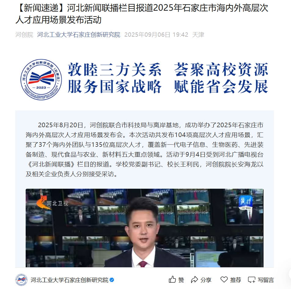 9月25日,《河北新闻联播》报道了2025年石家庄市海内外高层次人才应用场景发布活动。学校党委副书记、校长王利民,河创院院长安海龙以及相关企业负责人分别接受采访。
