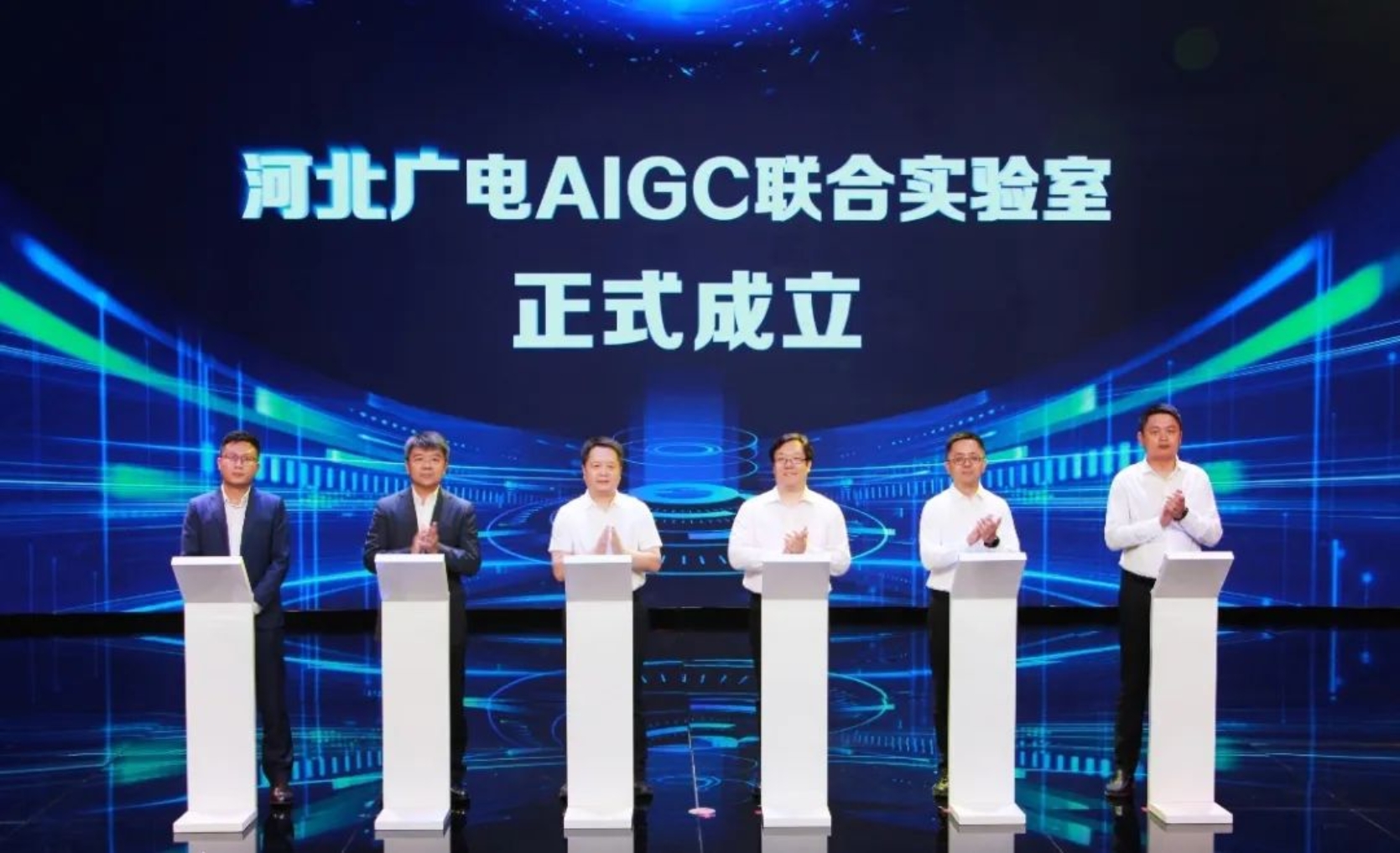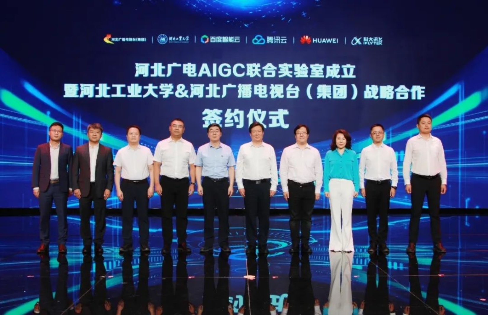 武鸿儒、韩旭,以及腾讯云、百度智能云、华为、科大讯飞等合作伙伴共同见证AIGC联合实验室的成立。下一步,校媒企合作方将以此为契机,深入贯彻实施国家创新驱动发展战略,加速培育“AI+广电”新质生产力,不断探索新的算法、模型和应用,着力打造智能化、个性化、高效化的内容生产传播体系和智能媒资体系,积极营造AI技术“产、学、研、用”创新生态,为加快建设经济强省、美丽河北,奋力谱写中国式现代化建设河北篇章作出新的更大贡献。