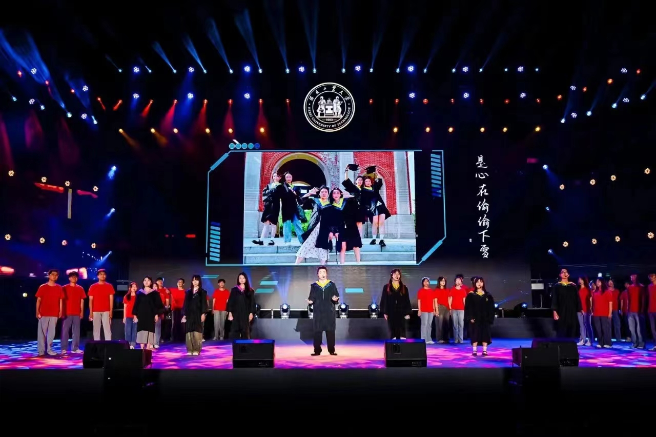 毕业典礼暨学位授予仪式结束后,伴随电声乐队联唱的《那些未曾远去的繁花光年》,“挺膺担当,青春启航——英国beat365官方网站2024年毕业晚会”拉开大幕。此次毕业晚会分为“欢聚·青春激昂”“印记·青春年华”“启程·青春远航”三个篇章,通过歌曲、舞蹈、京剧、相声、合唱等形式带着大家满载青春回忆,以少年姿态,扬帆起航。