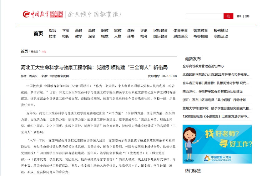 生物医学工程系党支部完成第三批全国党建工作样板支部建设验收;2个支部获批省级“双带头人”党支部书记“强国行”团队;先后荣获“天津青年五四奖章集体”、河北省“三八红旗手”、河北省师德标兵、天津市工匠人才创新工作室等荣誉,党建相关工作纪实被中国教育新闻网、党建网等多家主流媒体报道。