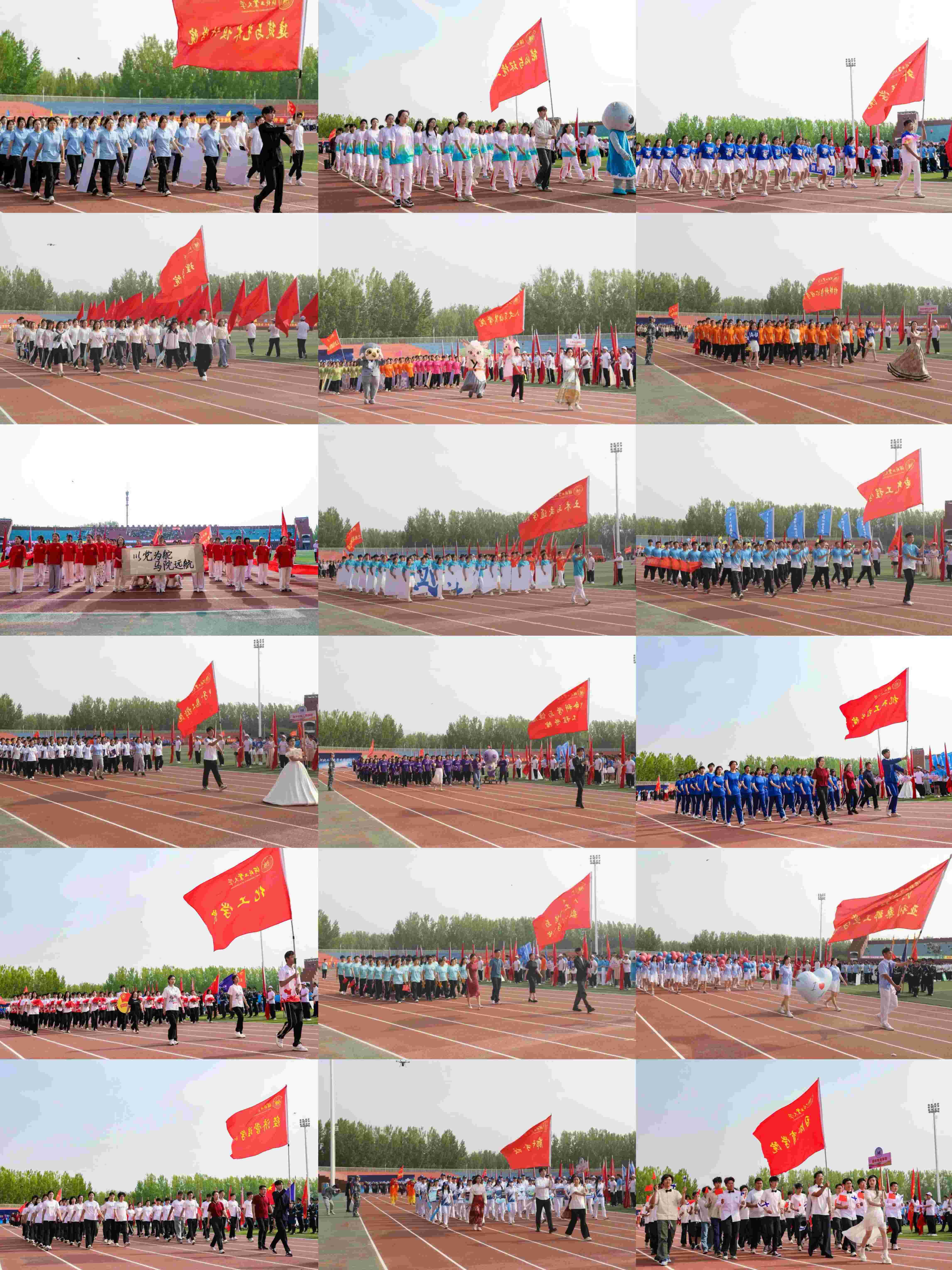 青春潮涌,万象争辉,各单位、部门代表方队依次闪亮登场!刚柔并济充满力与美的体操激情飞扬;憨态可掬的萌趣玩偶可爱非常;传统舞狮与科技萌犬联合热场;红色丝带编织的五角星诉说着青年学子的赤诚衷肠……