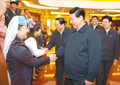 2014430日上午,正在新疆考察工作的中共中央总书记、国家主席、中央军委主席习近平在乌鲁木齐接见劳动模范和先进工作者、先进人物代表,并同他们座谈。这是习近平与劳动模范和先进工作者、先进人物代表亲切握手。新华社记者谢环驰摄