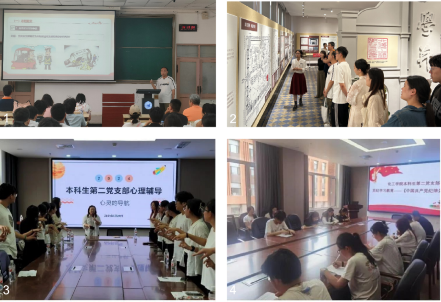 图1-4:能源与环境工程学院与天津大学环境学院共同开展“共学一堂党课,铭记北洋精神”联学共建活动,共建活动走进校史博物馆;化工学院本科生第二党支部开展“党纪学习教育+”系列活动,将党纪学习教育融入实验安全纪律、心理教育管理、国家安全观教育。
