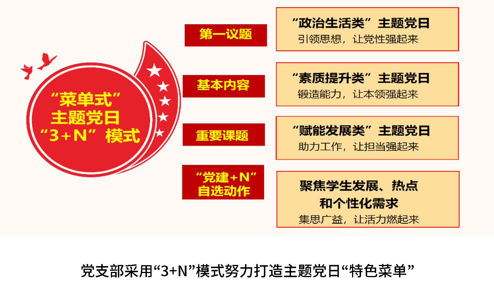校级学生组织第一党支部坚持把抓好“主题党日”作为强化党员教育、规范组织生活、提升组织活力的重要载体。党支部采用“3+N”模式努力打造主题党日“特色菜单”:设置政治生活类、素质提升类和赋能发展类3项规定动作,同时由支部成员根据当前热点和个性化需求提出“党建+N”自选动作。不断丰富内容、创新形式、服务学校中心工作,努力实现思想性、教育性和创造性、灵活性相统一。