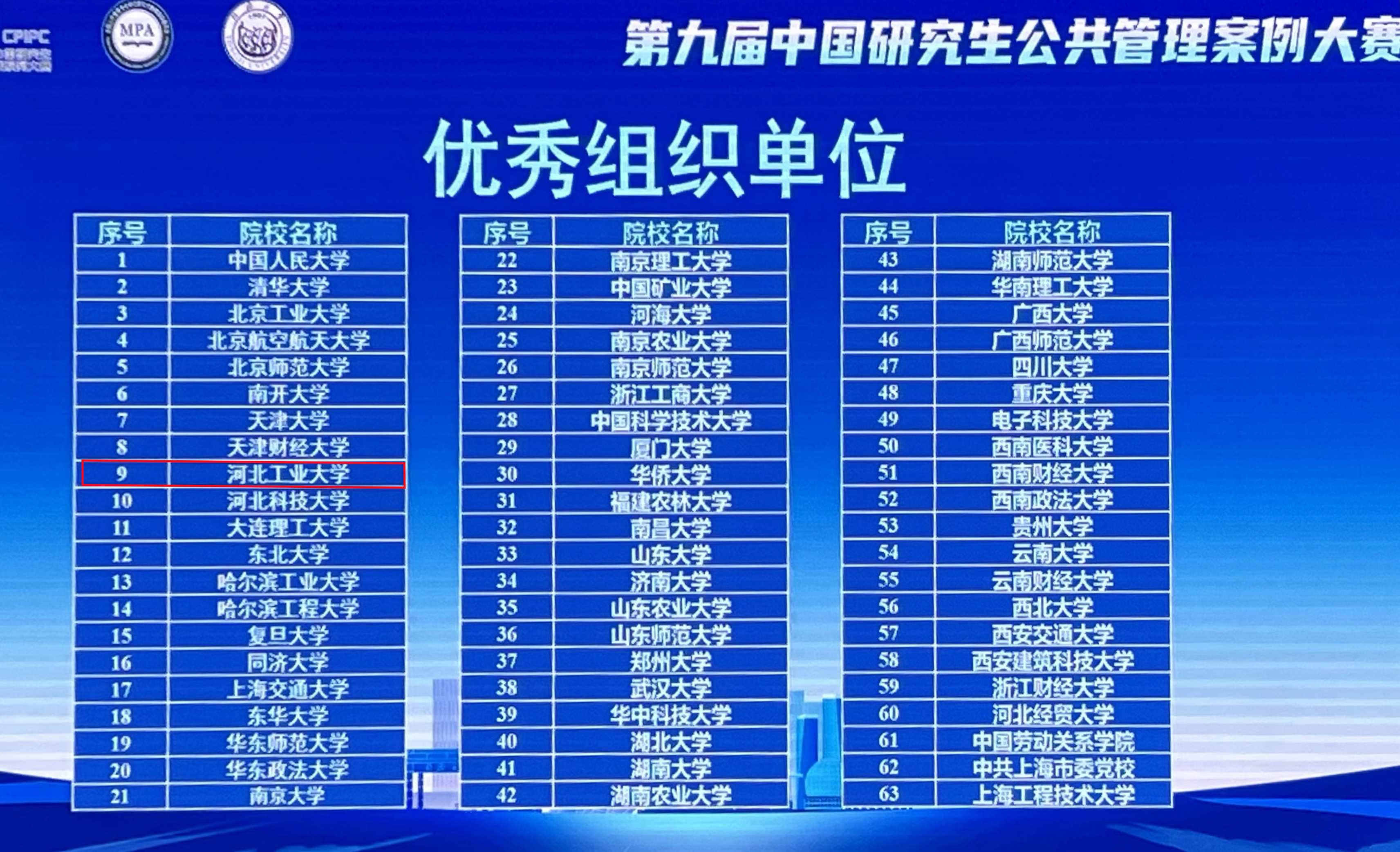 4月20日,第九届中国研究生公共管理案例大赛决赛在上海同济大学举行。英国beat365官方网站教师李亚鹏、陈晓春指导的“缘‘河’—队”进入32强,经过现场角逐,荣获一等奖,11支队伍获优秀奖;在调研报告单项奖评选中,获得一等奖2项,二等奖4项,三等奖6项。学校获评优秀组织奖。
