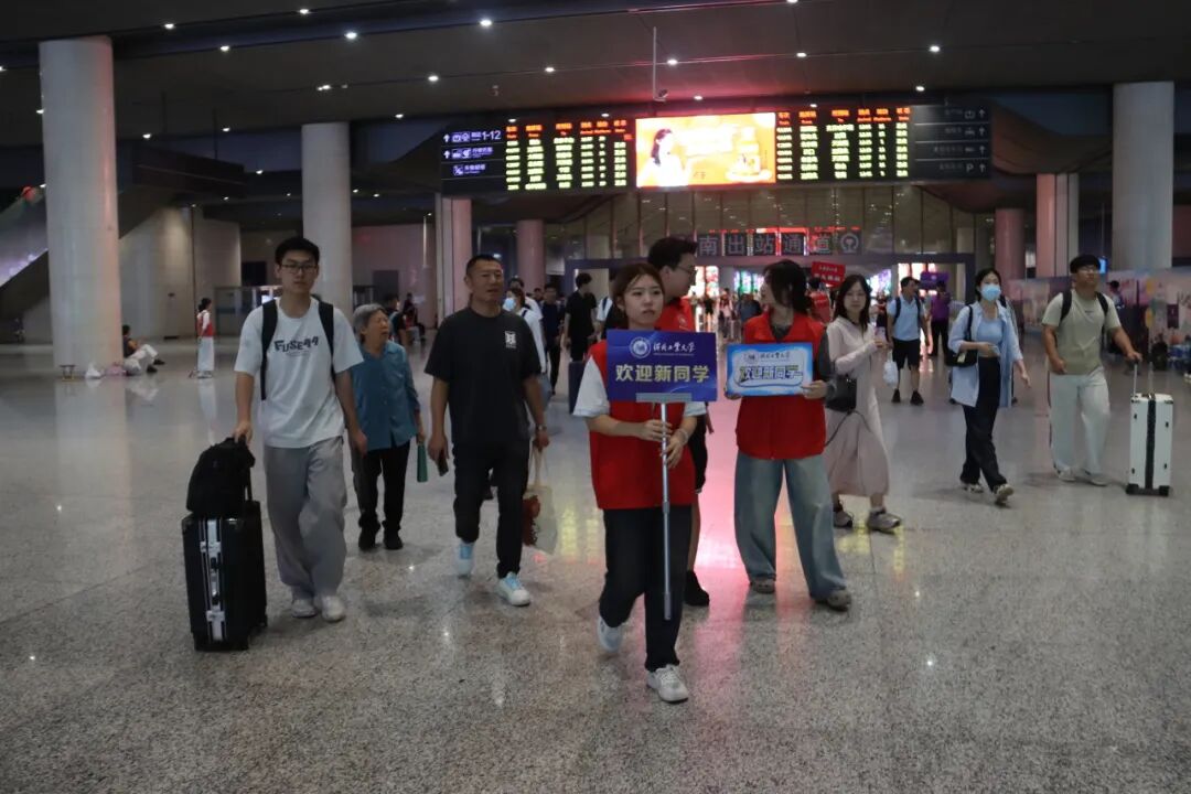 为确保新生入校便捷安全,学校在火车站、机场立岗,志愿者微笑相迎,举牌引路,提箱帮忙。大巴直达学校,温暖一路相伴。