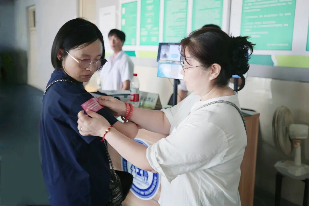 宿舍楼门口,工作人员细心为家长贴好一张“特别通行证”。