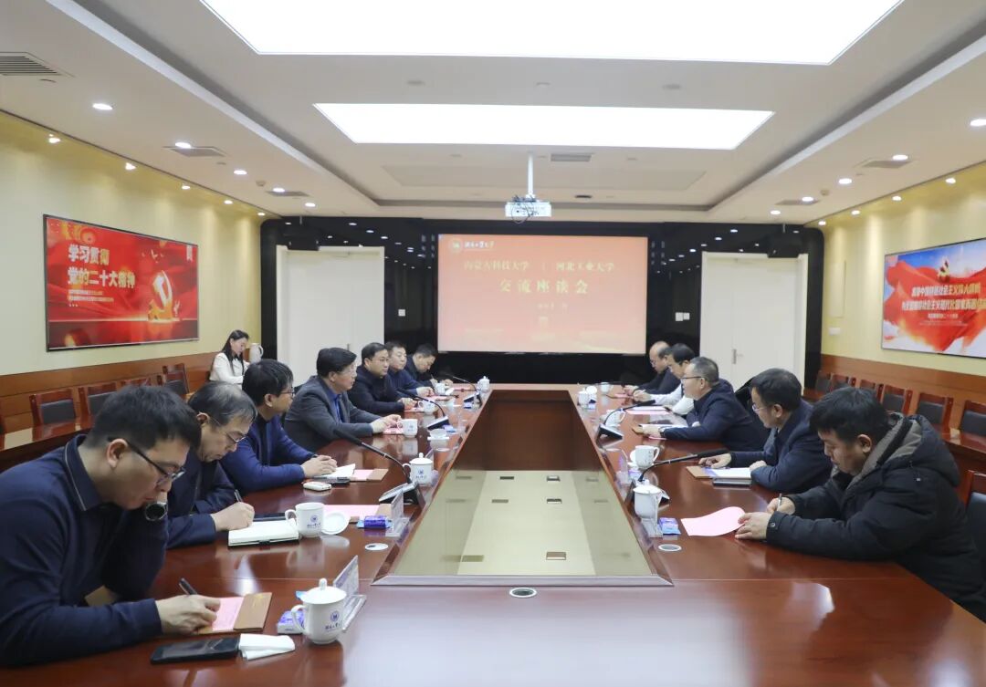 韩旭对呼和一行的到来表示热烈欢迎,他简要回顾了学校在历史沿革、办学特色、学科布局优化、高层次人才培养等方面的情况。韩旭着重介绍了河北工大在国家级科研平台、重点实验室及创新载体建设等方面的进展与成效,并坦诚分享了当前学校在学科交叉融合、高层次人才梯队建设、资源优化配置方面的思考与体会。他表示,两校合作潜力巨大,希望以此次交流为契机,同内蒙古科技大学建立更紧密的沟通协作机制,在学科共建、科研合作、师资交流、治理能力提升等方面深化互动,携手破解发展难题,共同推进高等教育高质量发展,为教育强国建设贡献两校力量。