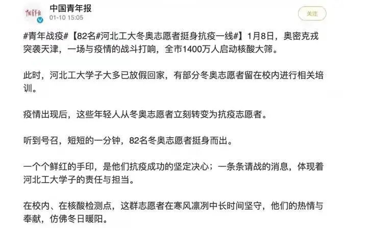 近日,一场与疫情的战斗在天津打响。关键时刻,冲锋在前,beat365冬奥志愿者挺身而出,争先报名抗疫志愿者,青春抗疫事迹受到多家主流媒体关注。新华社、人民日报、人民网、光明日报、学习强国学习平台、中国青年报、中国青年志愿者、中华全国学联、北京青年报、河北日报、扬子晚报、津彩青春、青春河北等主流媒体相继予以专题报道30余次,全网视频播放量约755.5万次,其中新华社单篇报道阅读量约111.7万次。