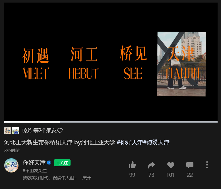 9 月 30 日,“你好 天津”平台发布了河北工大新生带你桥见天津的视频,视频拍摄了天津特色桥梁,展现了独特的桥梁文化和城市风光。