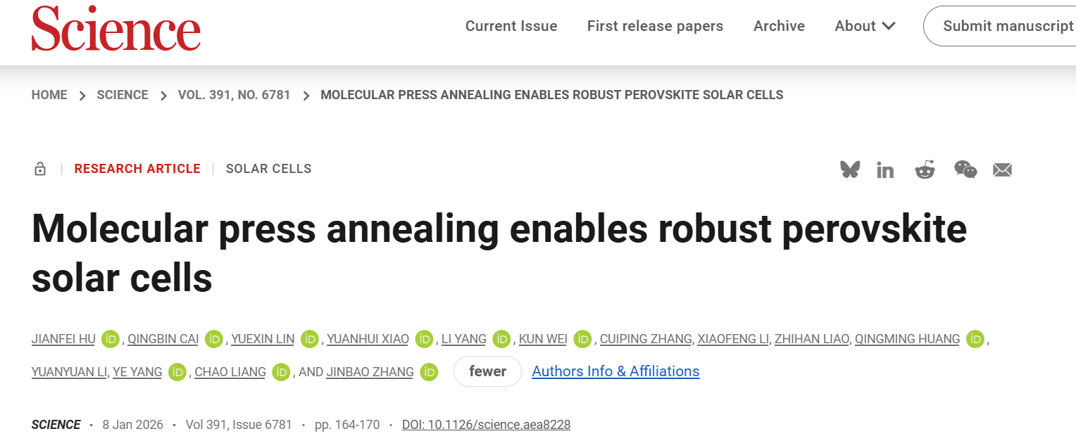北京时间2026年1月9日,拉斯维加斯3499官网登录入口数字经济学院绿色光电器件与储能电池团队青年教师蔡庆斌以共同第一作者在国际顶尖学术期刊《科学》(Science)发表题为《分子压印退火实现高稳定性钙钛矿太阳能电池》“Molecular press annealing enables robust perovski...