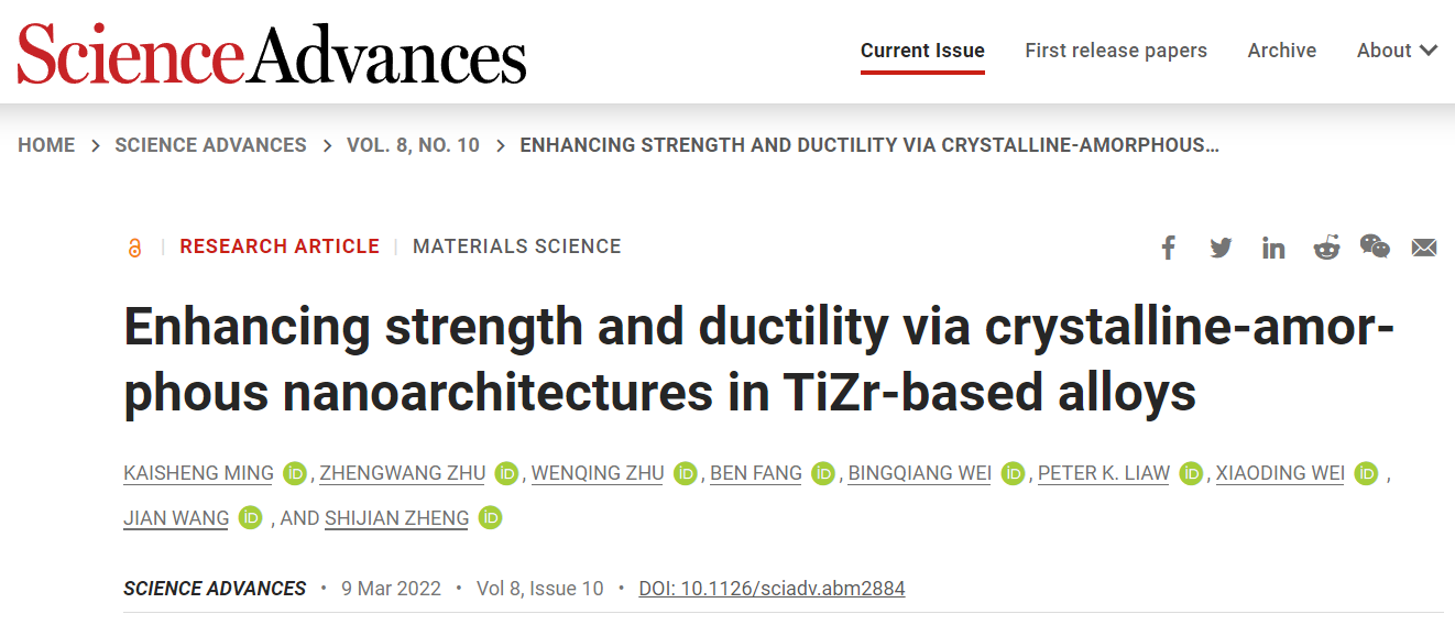 近日,英国beat365官方网站原子尺度研究团队在国际顶级学术期刊Science Advances上发表了题为“Enhancing strength and ductility via crystalline-amorphousnanoarchitectures in TiZr-based alloys”的研究论文,揭示了纳米尺度晶体-非晶三维双联续结构有助于改善材料强度和塑性的固有矛盾,实现材料强度和塑性的同时提升。论文的第一作者为英国beat365官方网站材料学院明开胜副教授,中科院金属所朱正旺研究员为共同一作,通讯作者为英国beat365官方网站郑士建教授、内布拉斯加大学林肯分校王健教授和北京大学韦小丁教授。论文第一通讯单位为省部共建电工装备可靠性与智能化国家重点实验室/材料科学与工程学院。
