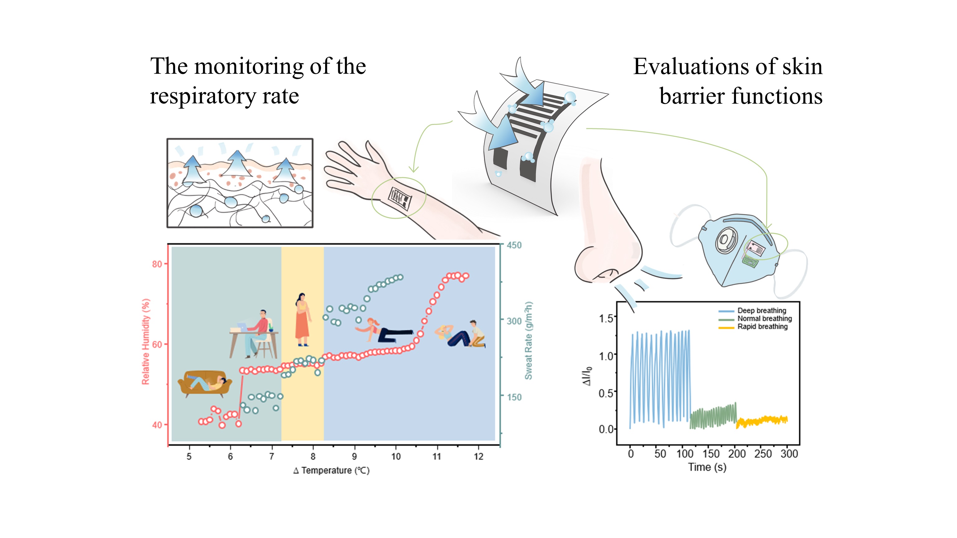 柔性传感器面临的另一个重要难题是制备成本高,工艺复杂,设备昂贵,不可降解等问题,针对此问题团队在行业中首次提出经过饱和NaCl溶液处理的铅笔-纸基高灵敏湿度传感器。利用纸本身的多孔吸湿性,高导电性手绘叉指电极,以及NaCl溶液对离子导电率的提升,实现了高响应量和高灵敏度。研究成果主要描述了传感器在人体健康监测方面的三种应用:口、鼻呼吸监测,面部湿度监测和不同活动状态下的出汗情况监测。不仅如此,这种传感器阵列还可以与尿布集成,形成智能尿布,提醒提早更换尿布。工作提出的设计和制造策略在可穿戴领域具有较大的商业应用畅想空间。该成果作为封面文章,以“Pencil-on-Paper Humidity Sensor Treated with NaCl Solution for Health Monitoring and Skin Characterization”为题发表在《Nano Letters》上。(DOI:10.1021/acs.nanolett.2c04384)。