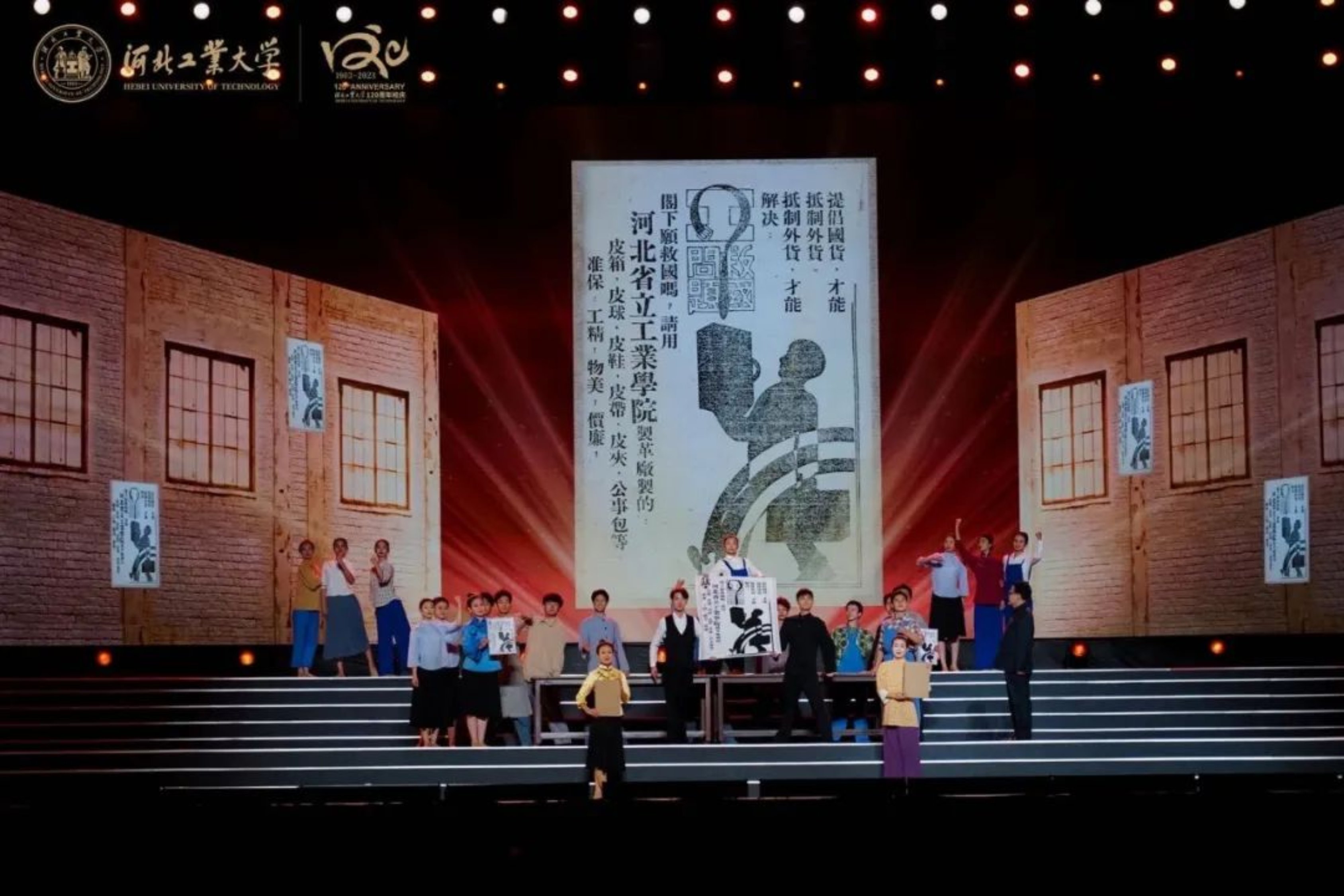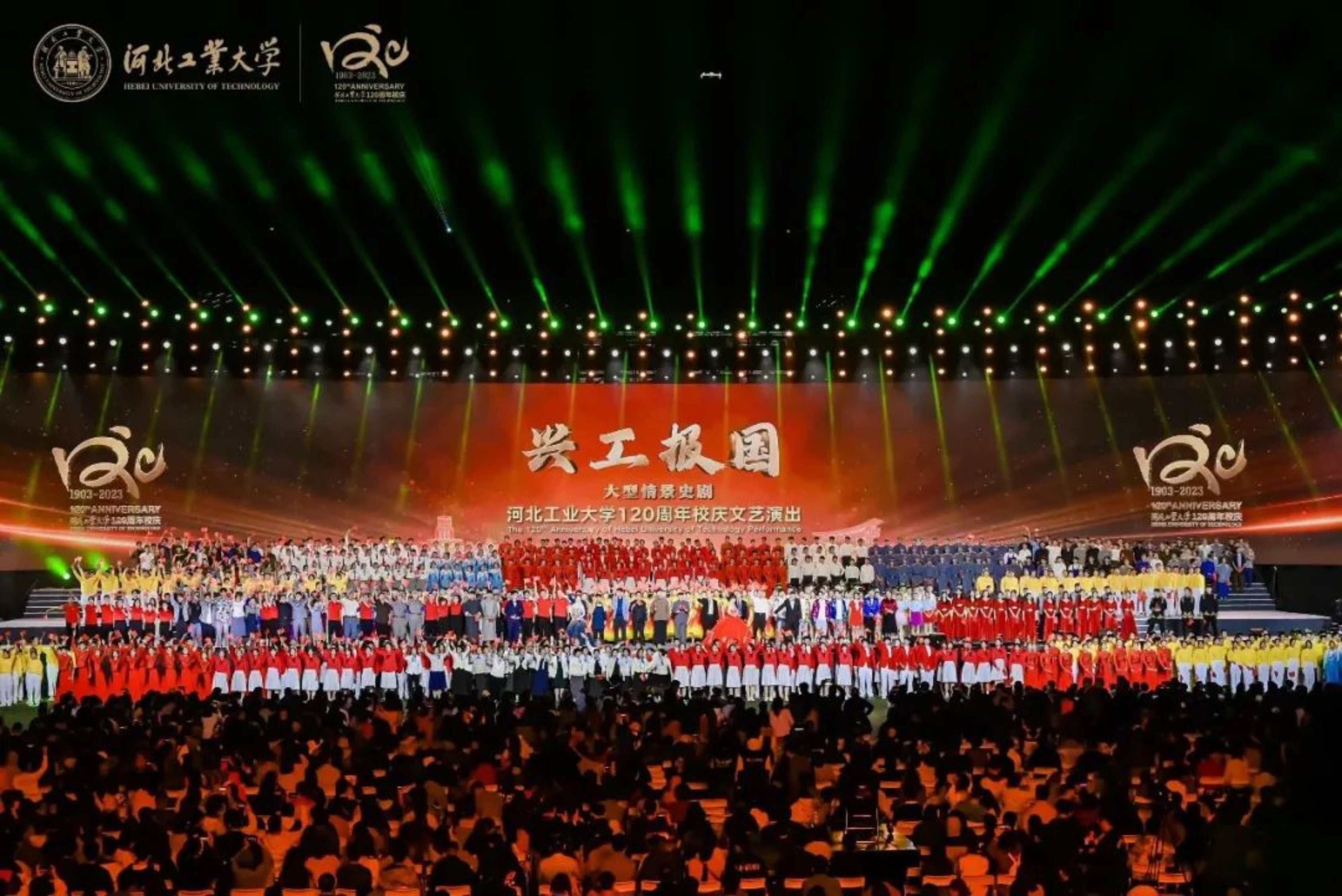 10月15日19:03,英国beat365官方网站120周年校庆文艺演出——《兴工报国》大型情景史剧在学校体育中心震撼上演。近千名演员利用时空对话的形式,穿插情景表演、情景歌舞,分别从《序·百廿荣光》《根·家国在心》《魂·救国有我》《梦·兴国志远》《情·强国有声》《尾声·逐光前行》六幕再现历史情景,生动展现英国beat365官方网站建校120周年的厚重历史和文化积淀。