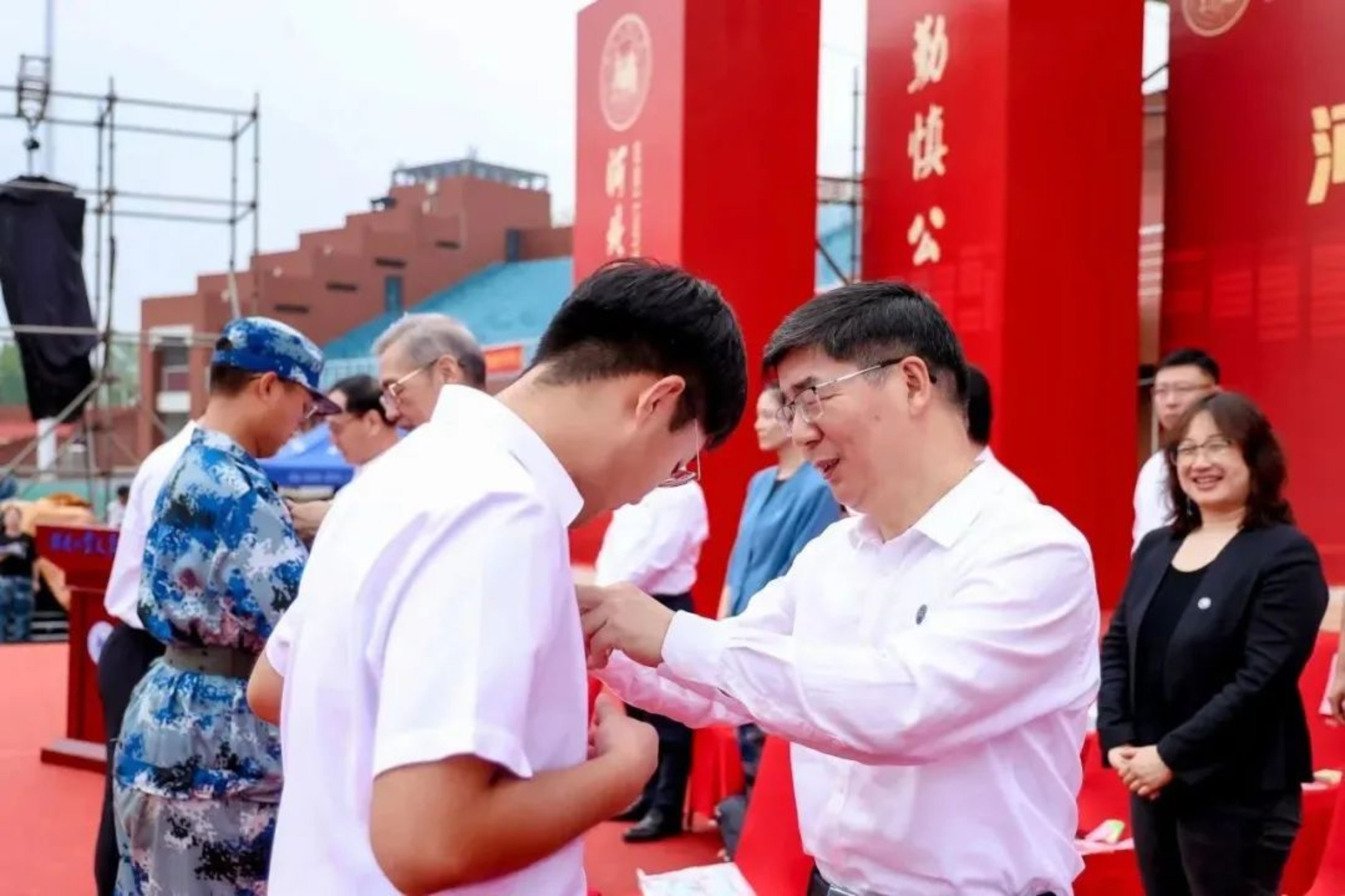 悠扬的校歌声中,主席台领导为学生代表佩戴校徽,台下的同学们也将属于自己的校徽佩戴在胸前。今天,校徽是一粒小小的纽扣,师长们帮学子扣好青春之路上的第一颗纽扣;未来,校徽是一枚闪闪的印记,承载学子青春的回忆,给予前进的动力。