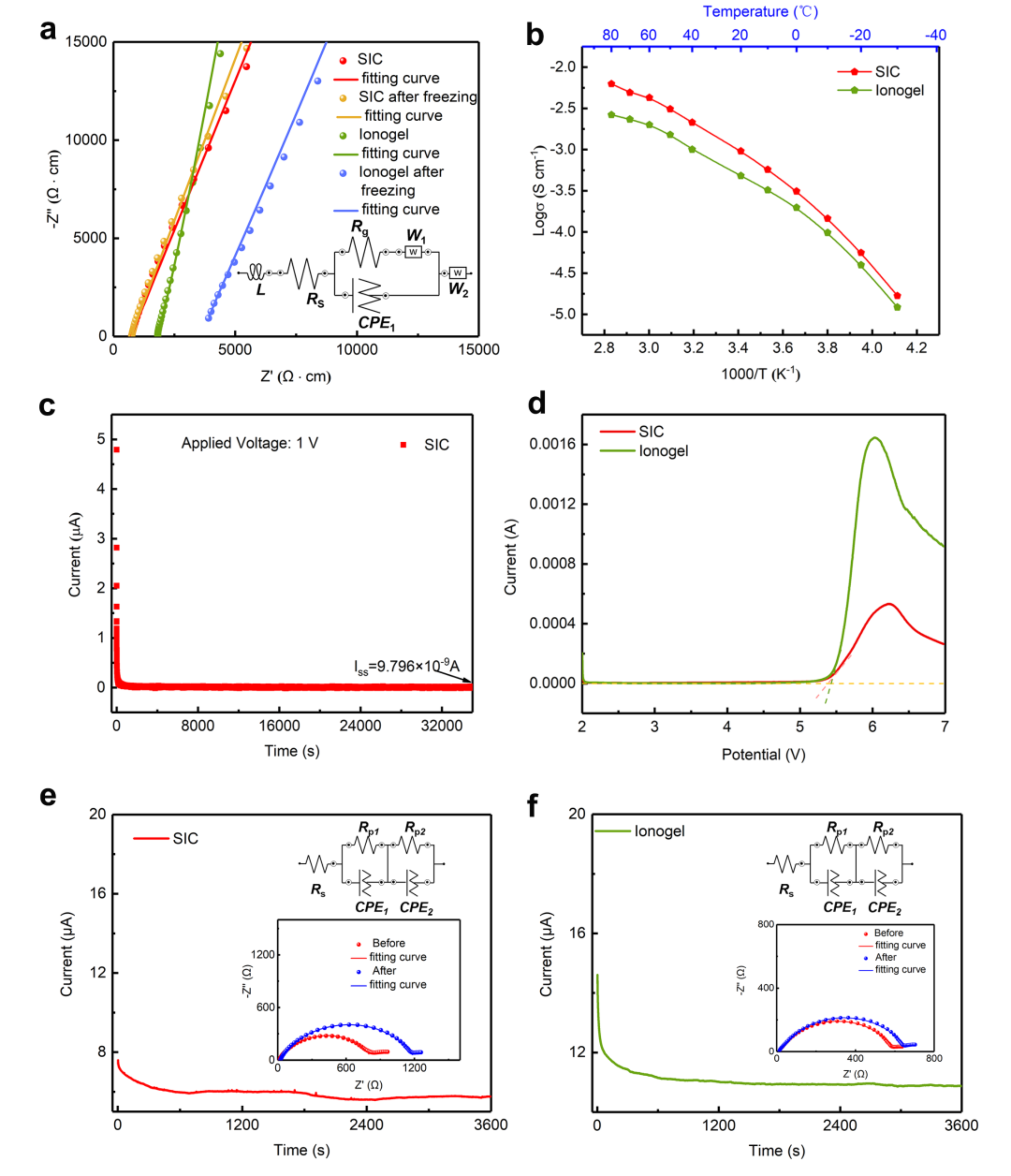 图2(a) SIC电解质和高浓度离子凝胶室温交流阻抗谱.(b) SIC电解质和高浓度离子凝胶的电导率-温度曲线.(c) SIC电解质直流极化曲线.