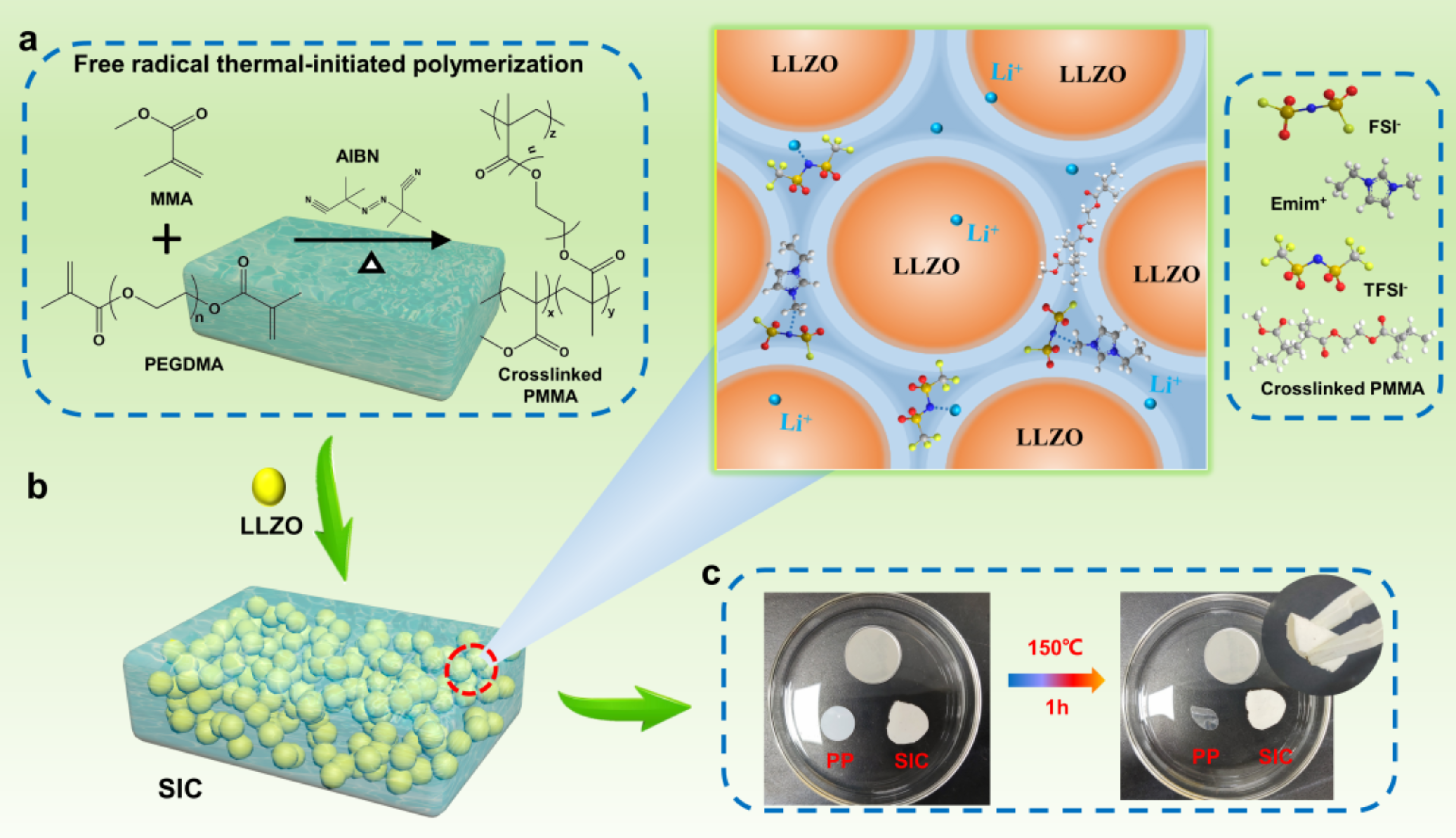 该研究中,通过将石榴石(LLZO)电解质纳米颗粒与高浓度离子凝胶(3m LiTFSI-EmimFSI-PMMA)有机结合,形成了一种高压单离子导电的“陶瓷中高浓度离子凝胶”(SIC)新型固态电解质。同时采用原位聚合的方法,来解决离子凝胶中聚合物在离子液体中的不混溶问题以及界面问题。制备流程如下图所示。与商业PP隔膜相比,所制备的SIC电解质具有更高的耐热性(图c)。