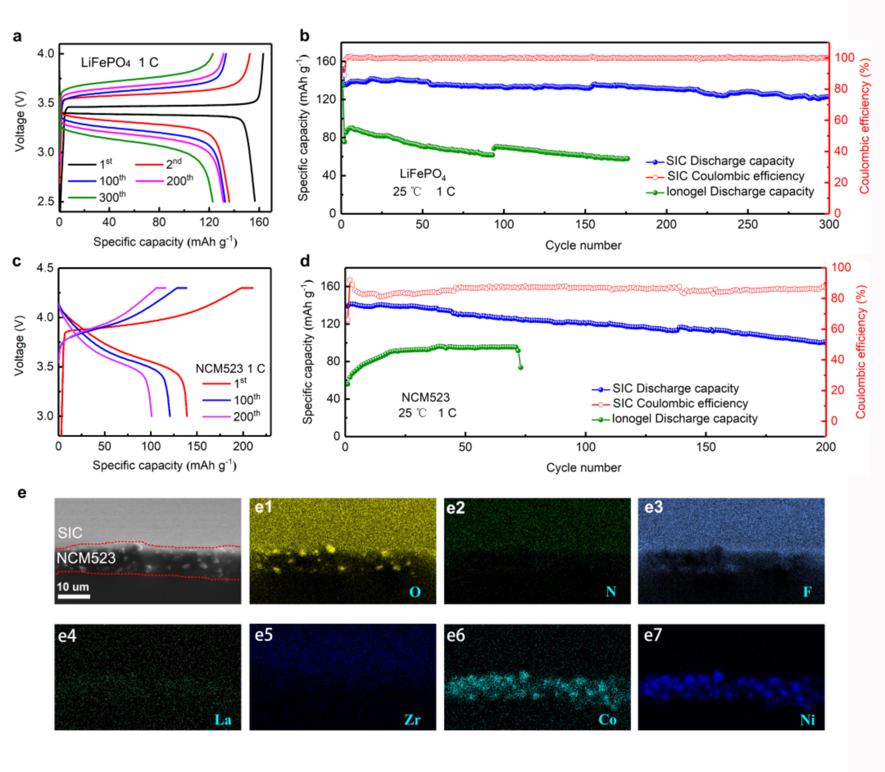 图3 (a)Li‖LiFePO4固态电池的容量-电压曲线.(b)Li‖LiFePO4固态电池的循环.(c)Li‖LiNi0.5Co0.2Mn0.3O2固态电池的容量-电压曲线. (d)Li‖LiNi0.5Co0.2Mn0.3O2固态电池的循环.(e) SIC/NCM523界面SEM/EDS图.