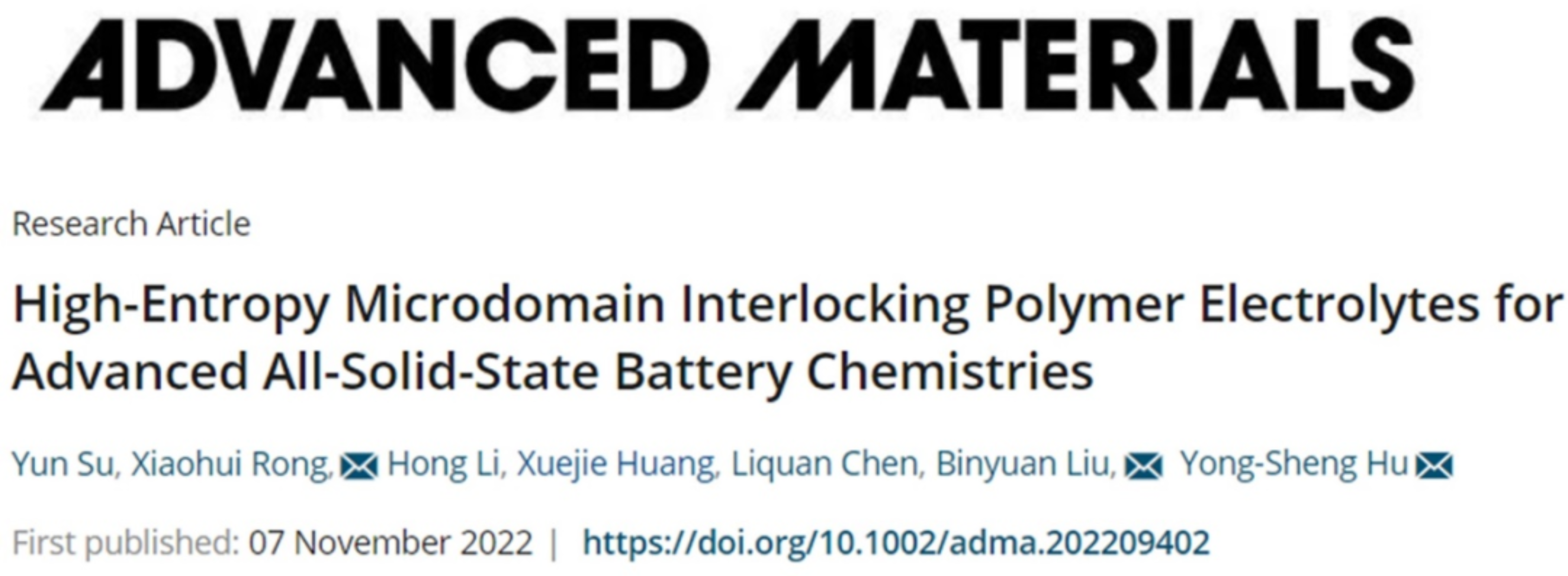此后,针对固态聚合物电解质普遍存在的机械强度和离子电导率难以同时提升的矛盾,联合团队通过超分子自组装驱动的高熵微域互锁策略,实现了高机械强度、高离子电导率和高阳离子迁移数的新型全固态聚合物电解质。该工作于2022年11月3日发表在材料领域国际著名期刊Advanced Materials(先进材料)(IF:32.086)上发表题为“High-Entropy Microdomain Interlocking Polymer Electrolytes for Advanced All-Solid-State Battery Chemistries”(高熵微区互锁聚合物电解质助力高性能全固态电池)。