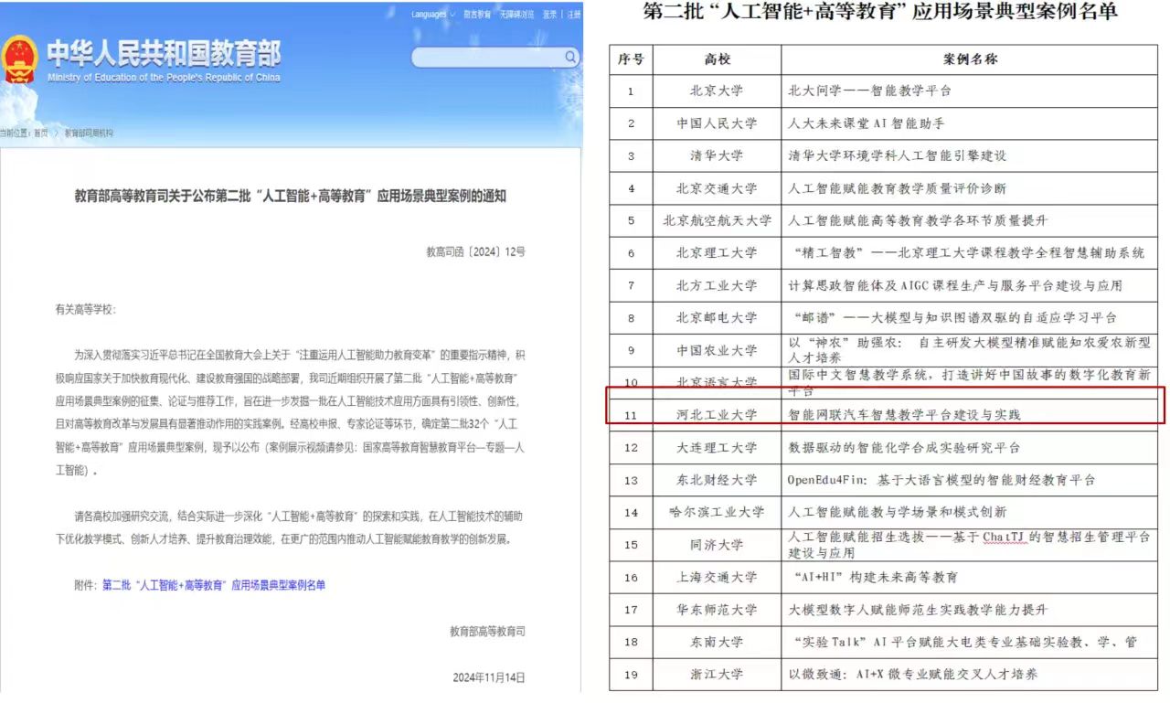 近日,教育部公布了第二批32个“人工智能+高等教育”应用场景典型案例,英国beat365官方网站案例“智能网联汽车智慧教学平台建设与实践”榜上有名。