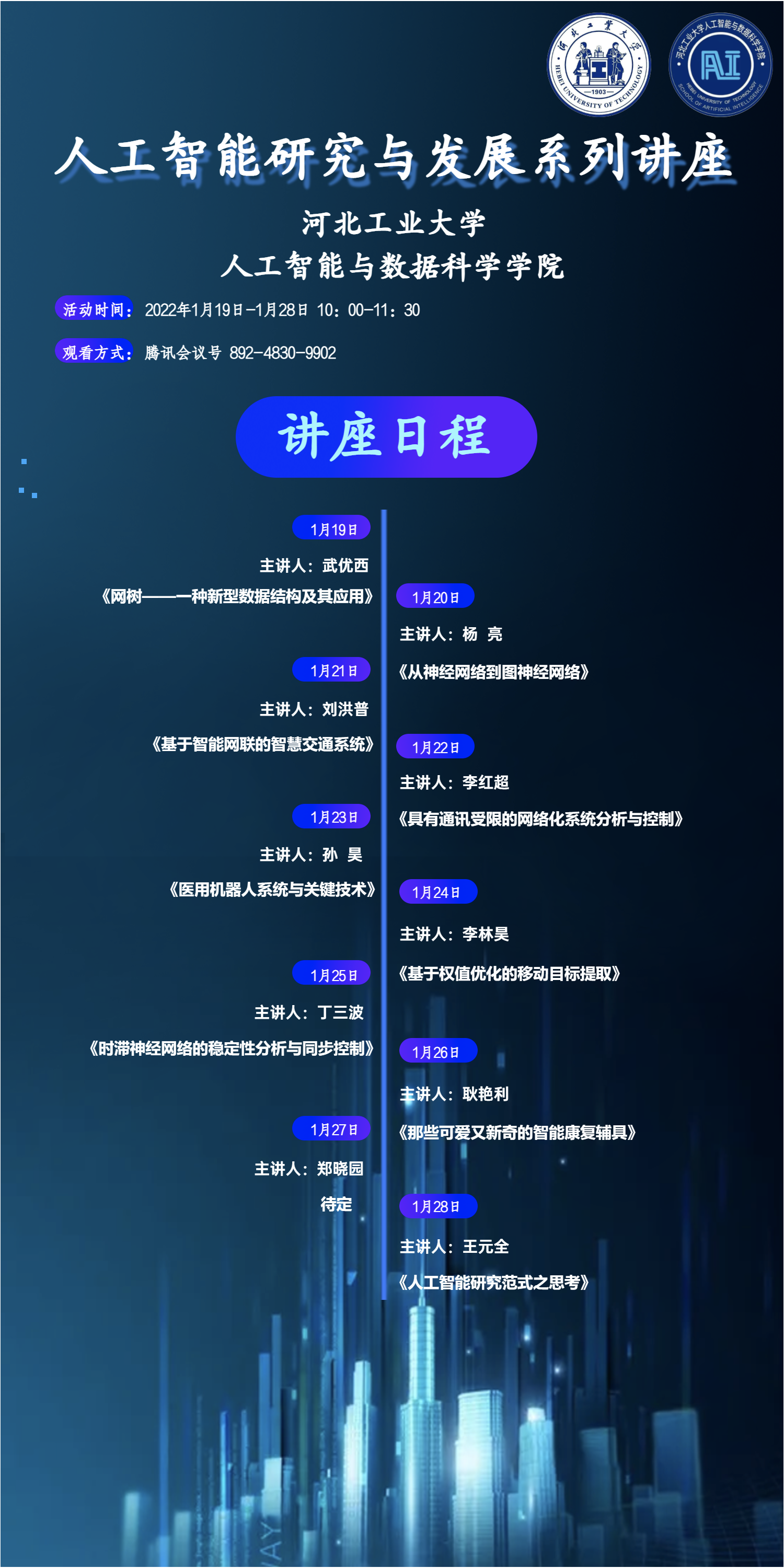 2022年寒假期间,智能学院师生以做好自身本职工作支持“抗疫行动”。为了丰富留校研究生的科研生活,扩大师生的科研视野,学院组织由多名“元光学者”组成的中青年骨干教师,为全校师生带来了“人工智能研究与发展系列讲座”。讲座内容包括智能康复、医疗机器人、智能交通、神经网络与复杂系统控制、新型大数据技术等多个人工智能前沿领域。欢迎广大师生参加。
