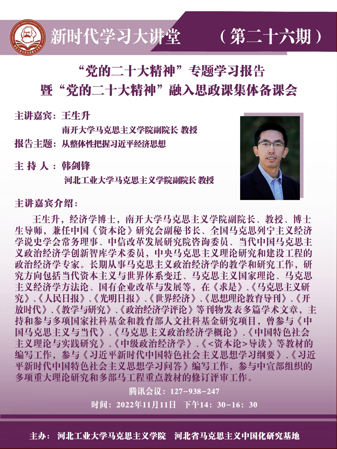 讲座题目:“党的二十大精神”专题学习报告暨“党的二十大精神”融入思政课集体备课会——从整体性把握习近平经济思想