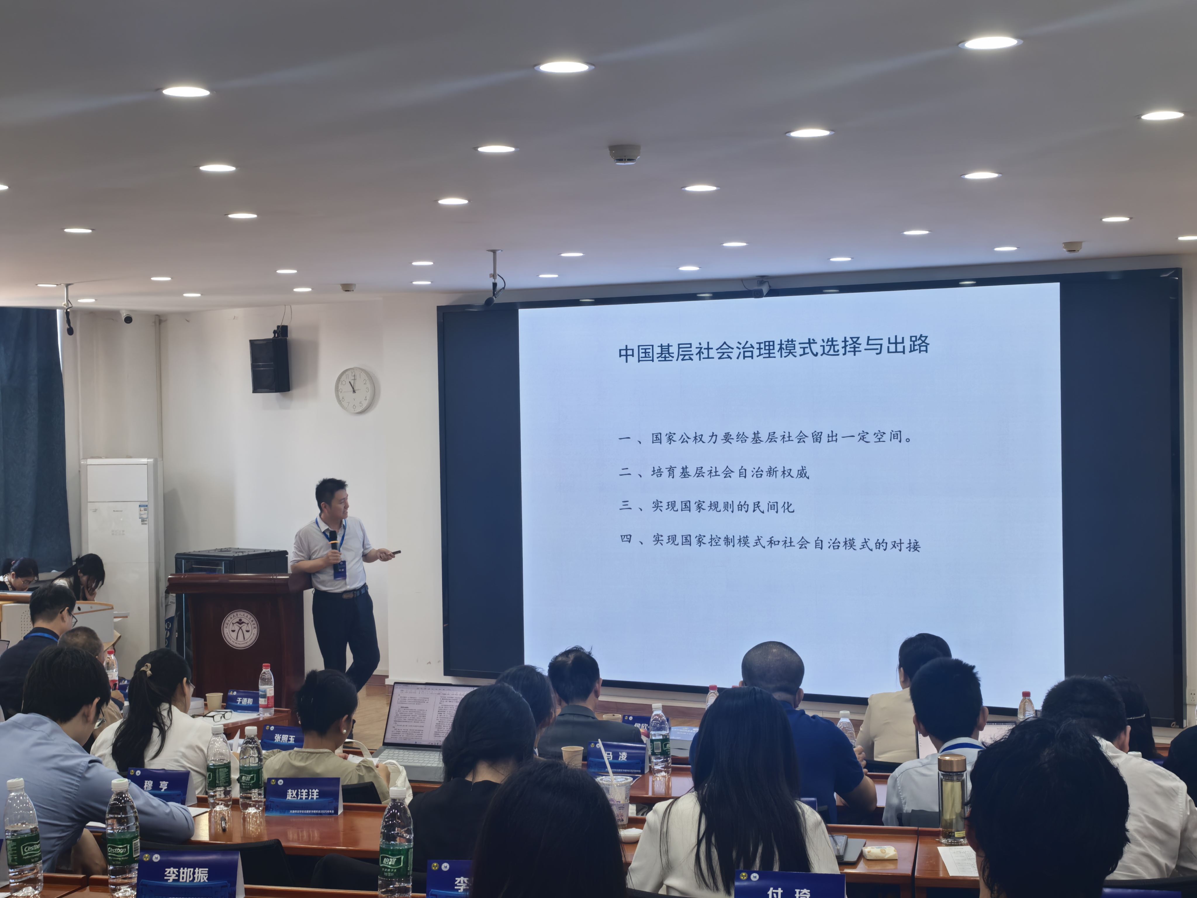 在主旨报告环节,华东政法大学原校长、教授何勤华以董必武的法律思想为题,梳理了董必武的个人经历及其法治思想的核心内容,他的法律思想和实践为新中国法治建设奠定了重要基础;西北政法大学原副校长、上海师范大学教授王健聚焦天津近代法学教育的发展轨迹,重点介绍了北洋大学法科的发展变迁,展现了天津、河北等地法学学科发展的历史脉络及其贡献;天津社会科学院研究员刘志松则以乡约为切入点探讨古代基层治理样态,重点分析了吕氏乡约与南赣乡约等典型案例,揭示了传统乡约作为民间规约在基层社会治理中的作用,展现了古代通过民间规约实现基层自治的智慧与实践形态。